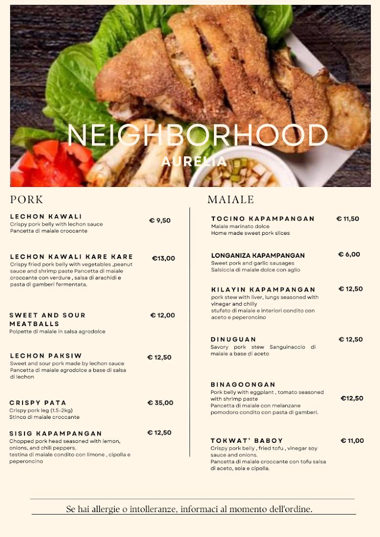 Neighborhood Aurelia Filipino Restaurant is a proud family-owned business bringing the authentic tastes of the Philippines’ culinary capital, Pampanga, directly to Rome’s vibrant food scene. The owners' passion for genuine Filipino cooking shines through every dish, promising authenticity and heart in every bite. The restaurant’s detailed menu highlights iconic dishes like the pork belly-packed Lechon Kawali and the soulful Pork Adobo simmered with soy and vinegar.